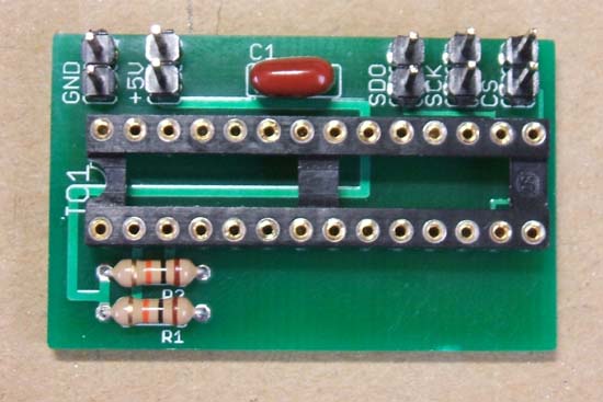 28PICソケット、コンデンサ(0.1μ)、抵抗2本 10Kオームを取り付けます。