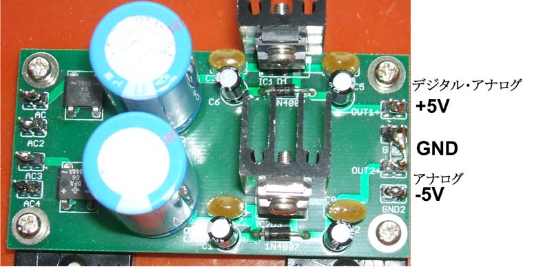 電源は、デジタル用+5V、アナログ±5Vが必要です。