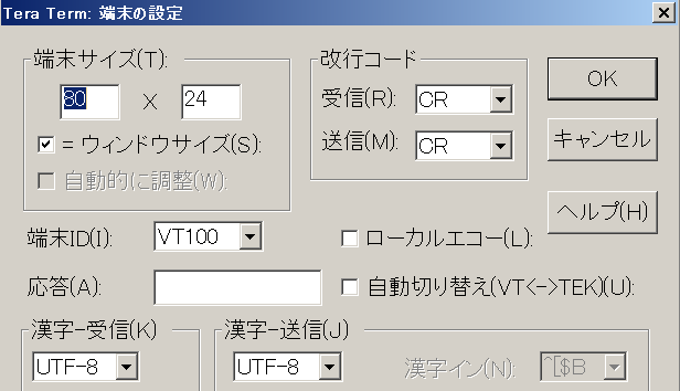 リターンキーの改行コードには’CR’と’LF’を設定できますが、今回のサンプルプログラムは’CR’のみ設定してください。